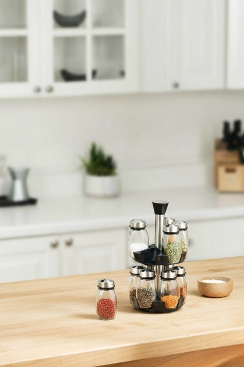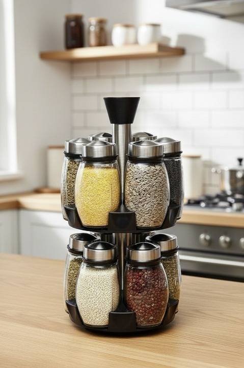 Baharatlık Çift Katlı 12’li 360 Derece Dönebilen Cam Tuzluk Ve Baharatlık Standı, mutfakta düzeni korurken aynı zamanda pratikliği artırır. Yemek yaparken sürekli baharat arama derdini ortadan kaldırır.