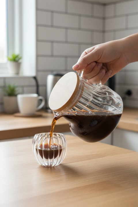 Borosilikat ısıya dayanıklı cam sürahi, oluklu çizgili tasarım.